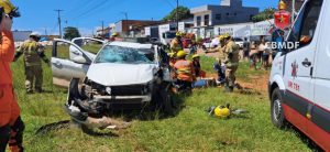 A colisão envolveu uma motocicleta Honda azul, um Fiat Cronos branco e um caminhão baú vermelho. Com o impacto, o carro de passeio e o caminhão capotaram. Os ocupantes do Fiat ficaram presos às ferragens e precisaram ser retirados pelos bombeiros após o controle dos riscos no local.