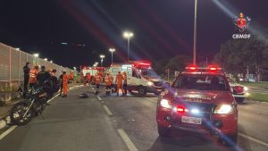 O Corpo de Bombeiros Militar do Distrito Federal (CBMDF) chegando ao local, encontraram dois homens que estavam em uma motocicleta preta e outras duas pessoas, um homem e uma mulher, que foram atingidas pelo veículo.