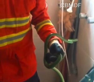 Com a ajuda dos moradores, os militares localizaram uma cobra da espécie cipó-verde (Erythrolamprus typhlus) dentro da residência.