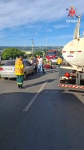 O Corpo de Bombeiros Militar do Distrito Federal (CBMDF) foi acionado e enviou três viaturas ao local. Ao chegarem, as equipes encontraram uma colisão entre uma motocicleta Honda CG 160 vermelha, um Chevrolet Classic prata e um caminhão Ford Cargo branco.