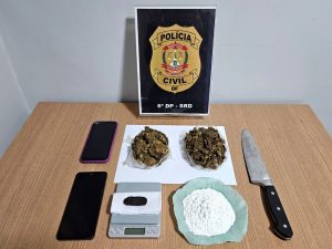 Durante a abordagem, foi encontrada porção de haxixe em posse do autor. Em continuidade às diligências, a equipe policial deslocou-se até a residência do investigado, onde, após buscas, foram localizadas outras porções de skunk e cocaína, bem como uma balança de precisão utilizada para o fracionamento e posterior comercialização das drogas.