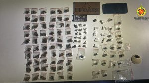 Ao chegarem à área indicada, os policiais constataram movimentação típica de comercialização de drogas e realizaram a abordagem do suspeito. Durante a busca pessoal, nada de ilícito foi encontrado com o adolescente. Contudo, foi realizada varredura nas imediações com o apoio da cadela policial Paçoca, que localizou, próximo a uma caçamba de entulhos e também no interior de uma loja abandonada, diversas porções de entorpecentes, totalizando 60 porções de skank, 19 porções de cocaína e 32 porções de haxixe.
