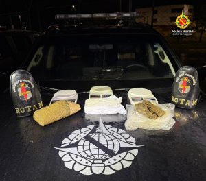 Durante a busca na residência, foi localizada uma mochila contendo uma porção grande de maconha e dois tabletes de cocaína. Além das drogas, foram apreendidas três balanças de precisão e facas com resquícios de entorpecentes, materiais comumente utilizados no preparo e fracionamento das substâncias para venda.