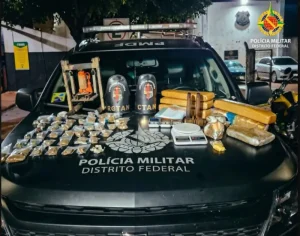 Ao final da ocorrência, foram apreendidos 49 papelotes de maconha, cinco tabletes de maconha, um tablete de skunk, seis papelotes de cocaína, quatro balanças de precisão, 50 munições calibre 9 mm, uma munição deflagrada calibre .38, dois carregadores alongados de pistola, uma prensa hidráulica, insumos utilizados para preparo de drogas, invólucros para embalagem, além de um veículo.